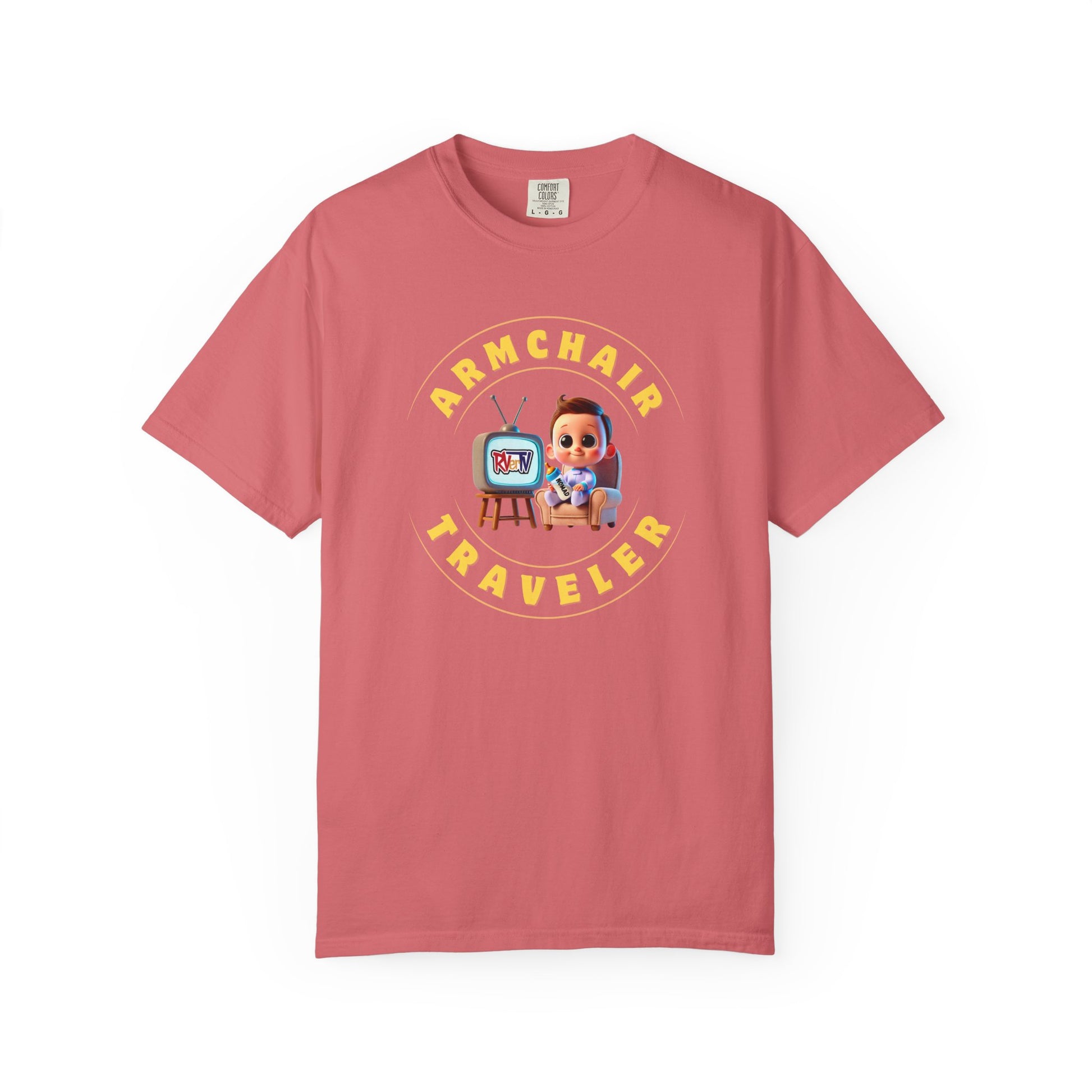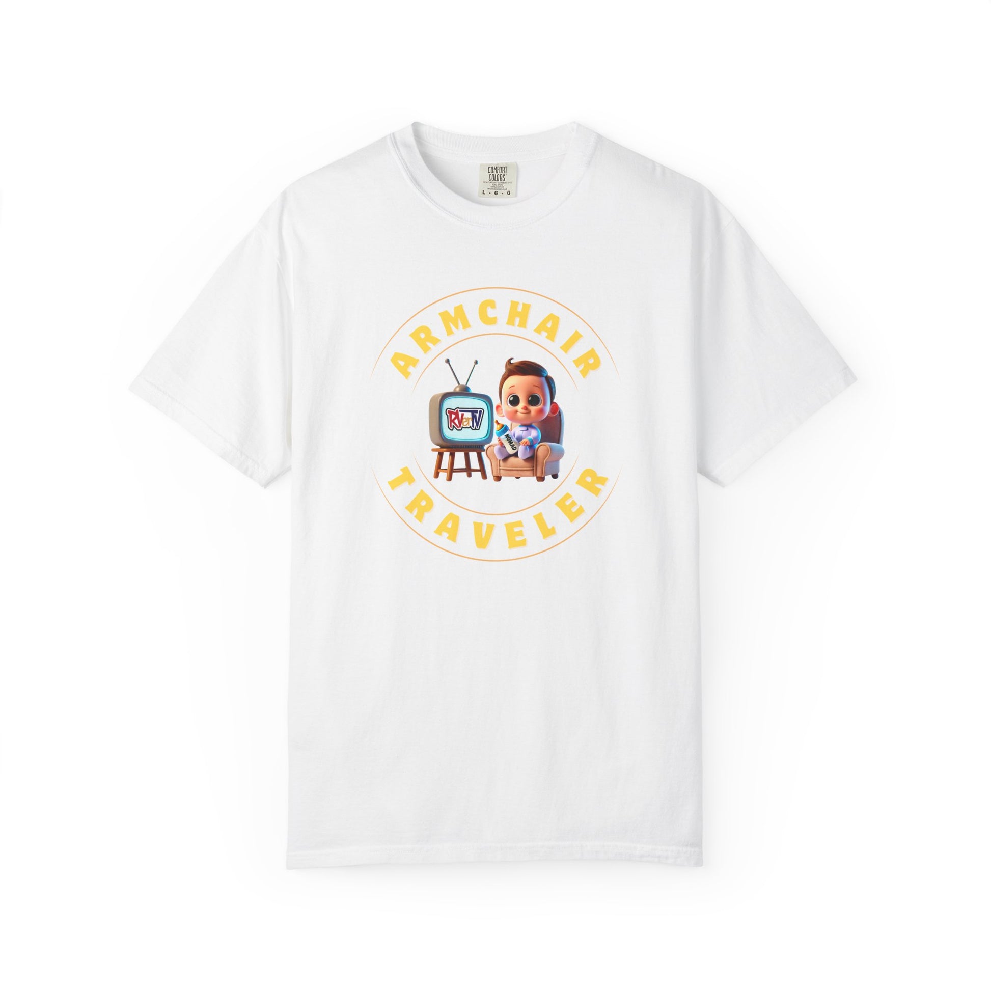 Introducing our adorable "Baby Armchair Traveler" t-shirt, featuring the world's tiniest RV enthusiast! This pint-sized explorer is kicked back in a giant armchair, with bottle in hand, totally mesmerized by RVerTV YouTube adventures. Who says you need to walk before you can travel? This little adventurer's already mastering the art of armchair exploration!