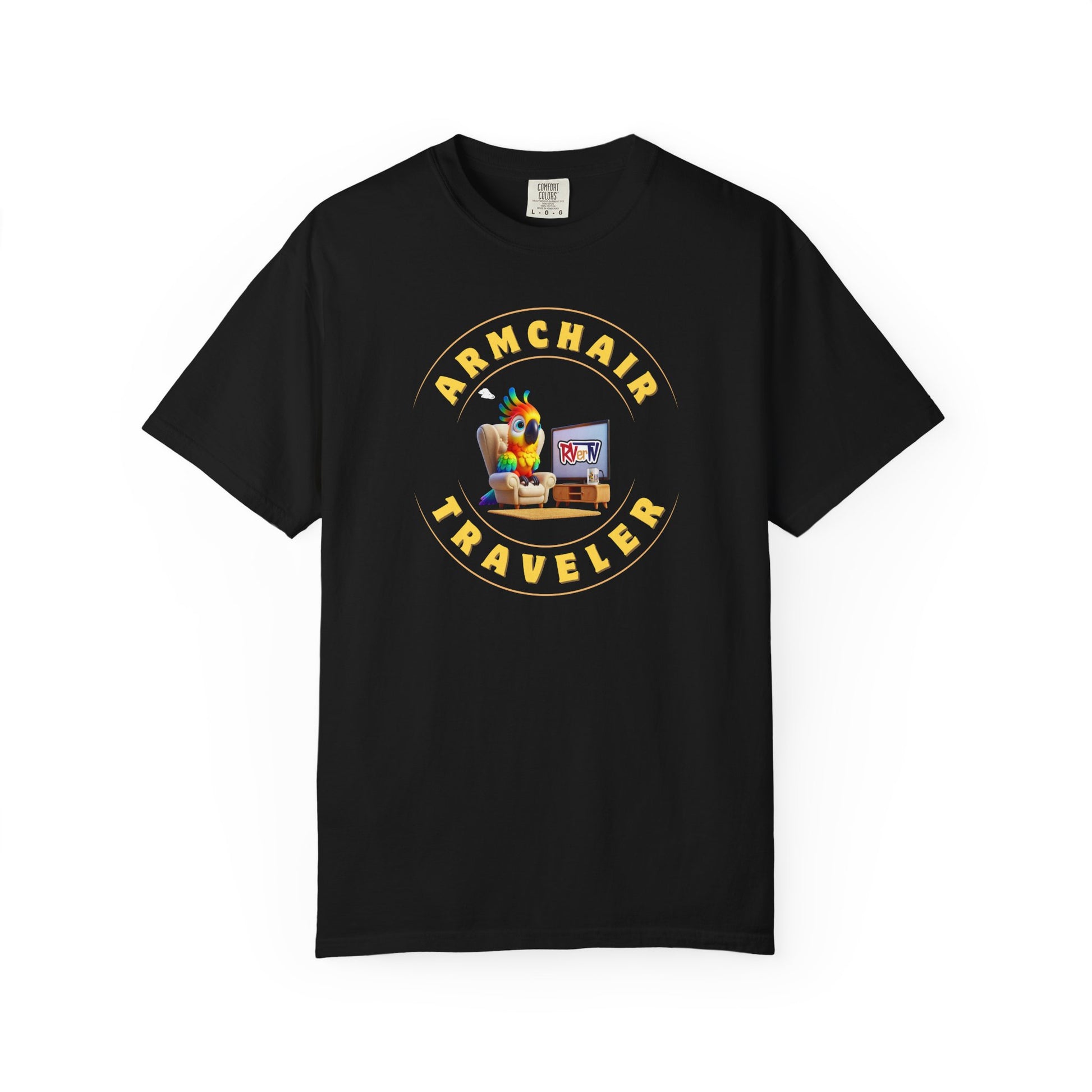 Introducing our delightfully quirky "Armchair Traveler Bird" design, where a feathered friend proves you don't need to migrate to explore! Perched perfectly on a plush armchair, this cheerful bird has traded its nest for a cozy seat, completely transfixed by RVerTV YouTube adventures. Who needs to fly south when you can wing it through virtual camping trips from the comfort of your favorite chair - no bird seed required!