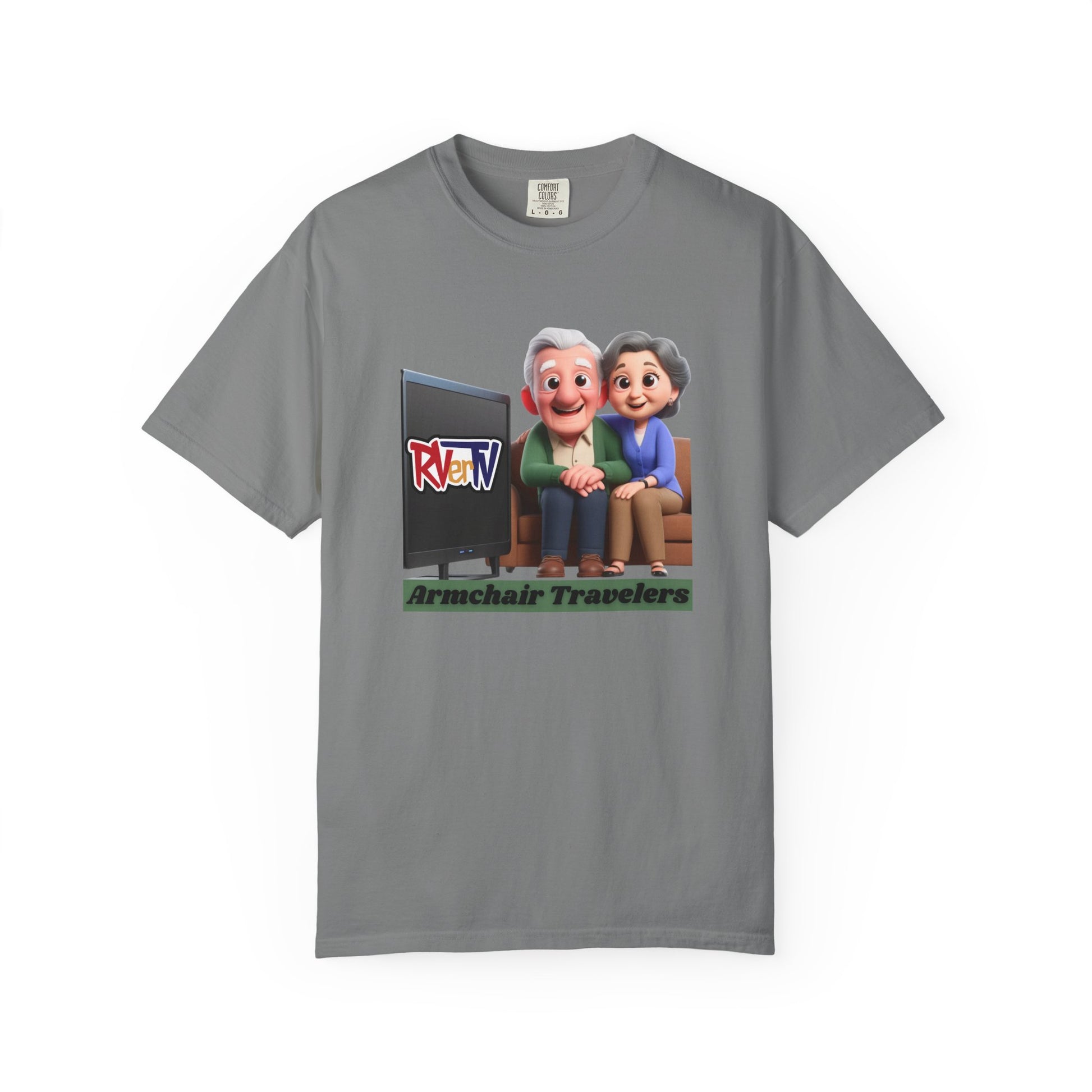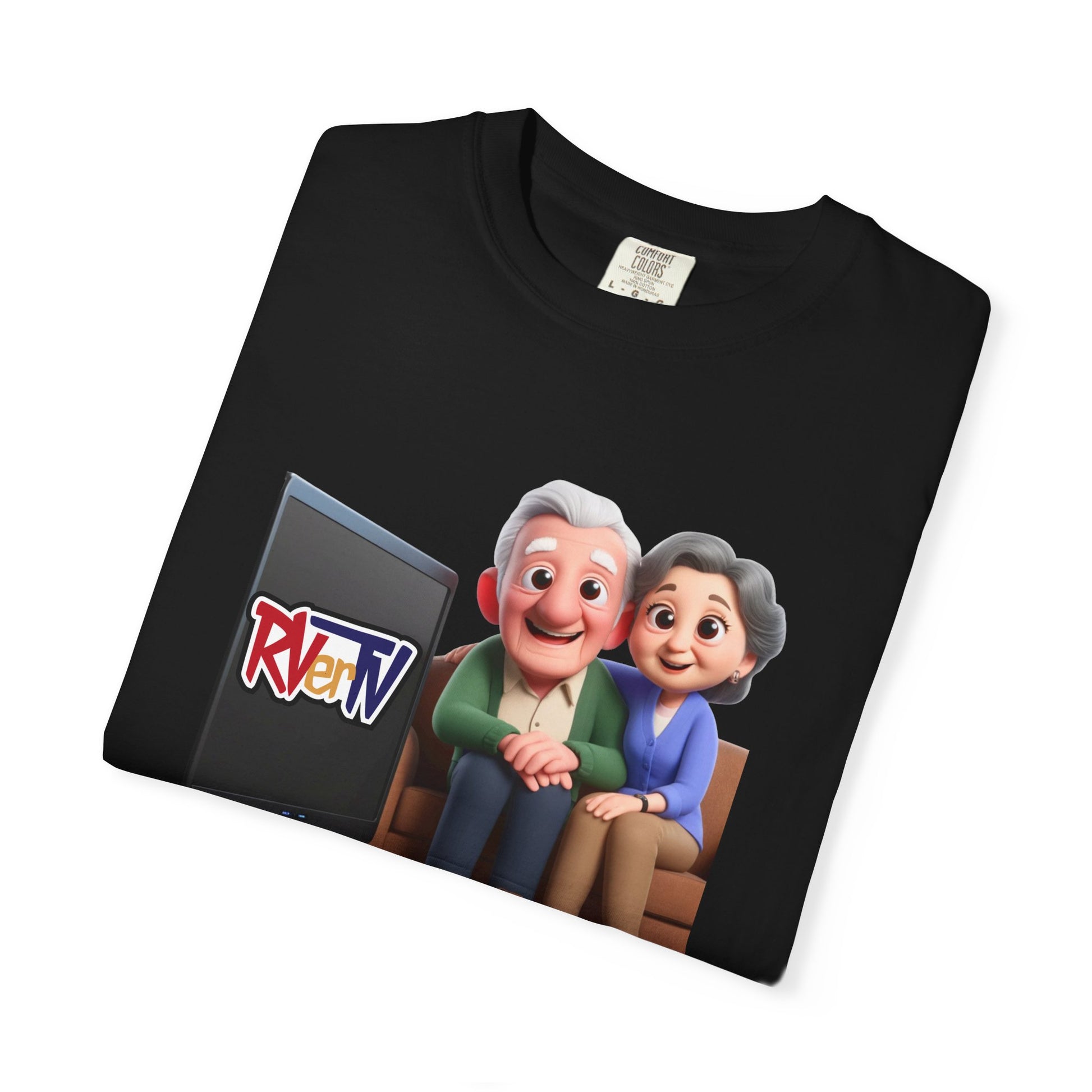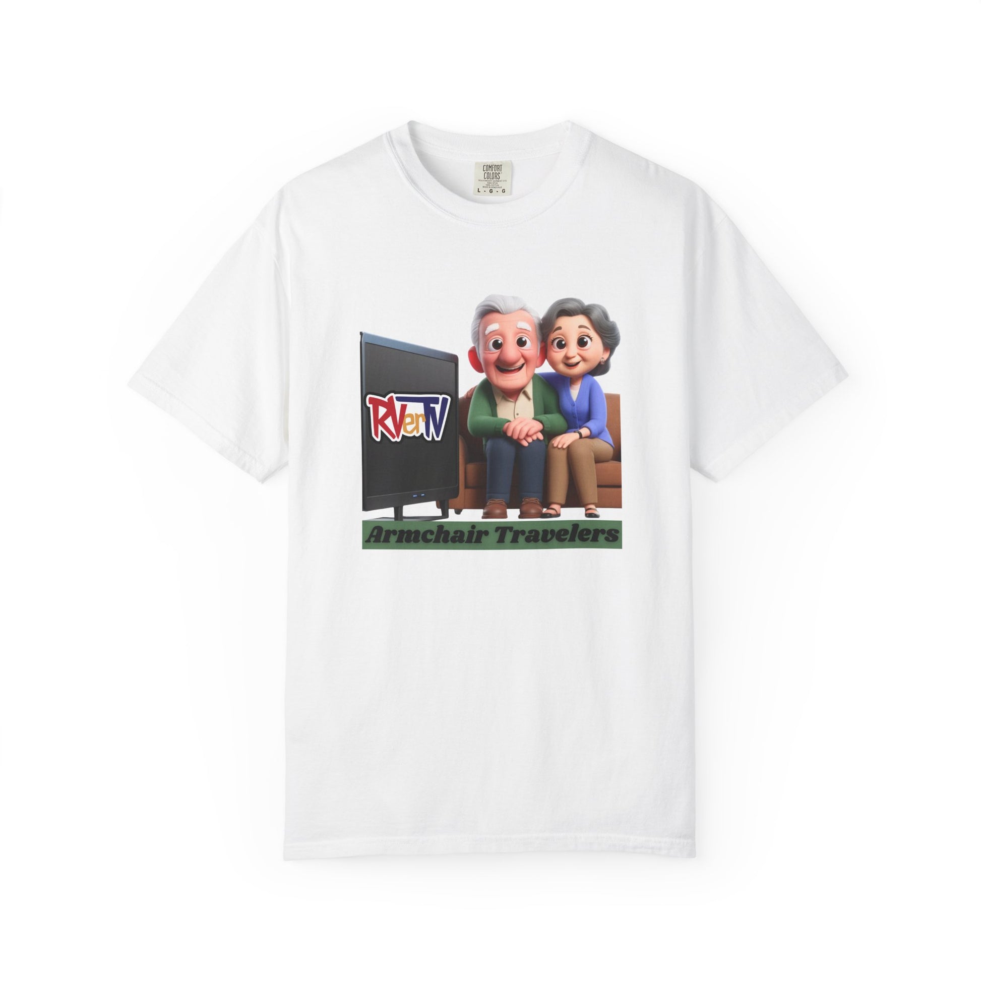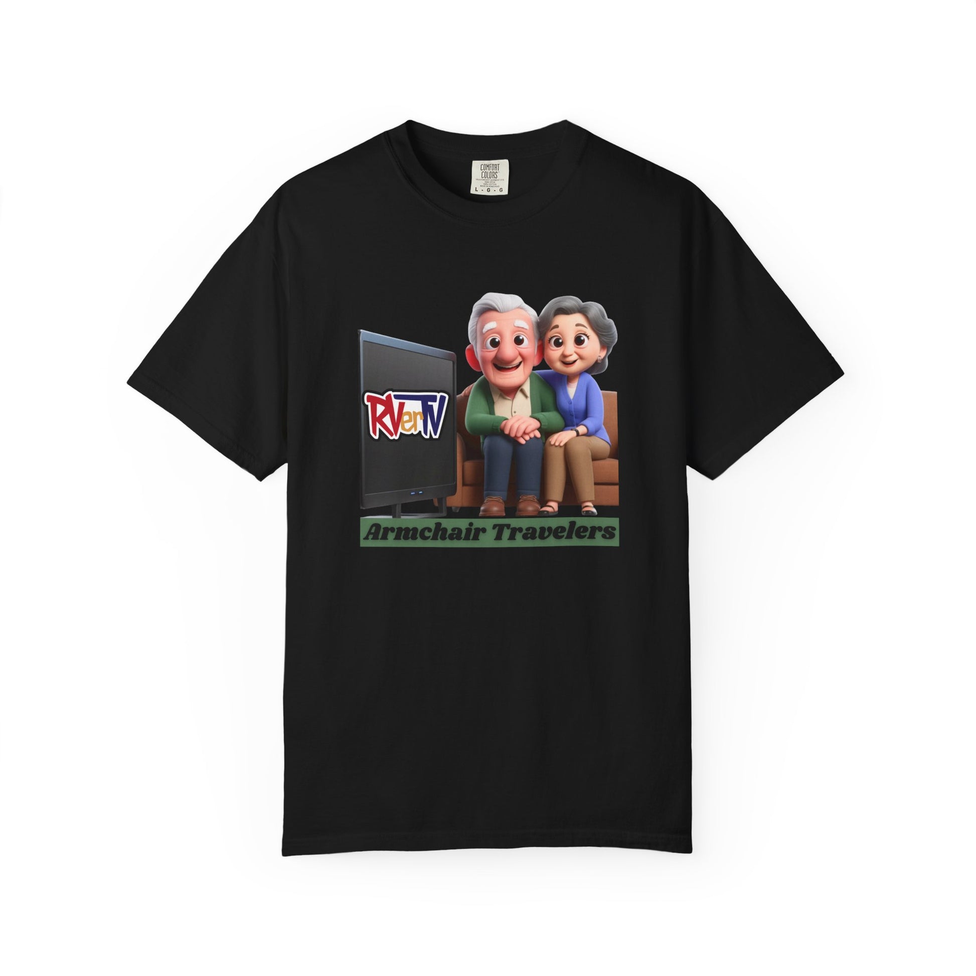Meet our heartwarming "Armchair Travelers Couple" t-shirt, where wisdom meets wanderlust! This charming design features a snuggly senior duo who've mastered the art of sofa expeditions, complete with matching fuzzy slippers and their trusty TV remote. They're living their best RVerTV life from the comfort of their favorite couch—because who says you need to leave your recliner to hit the road?