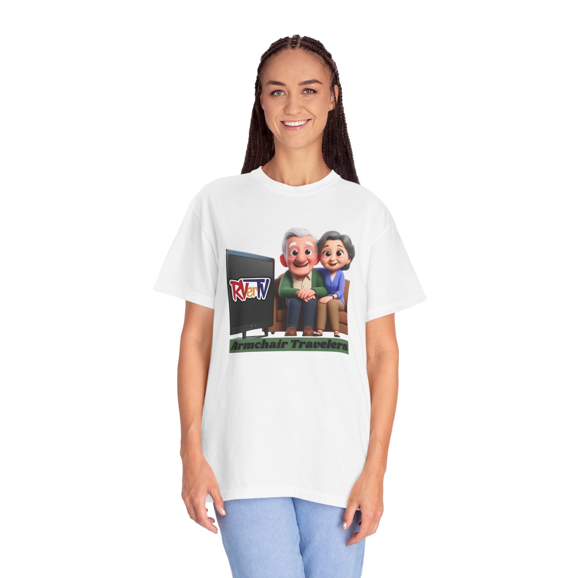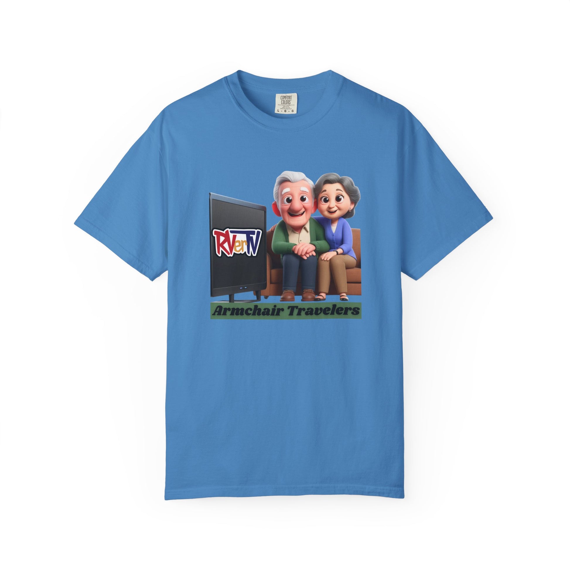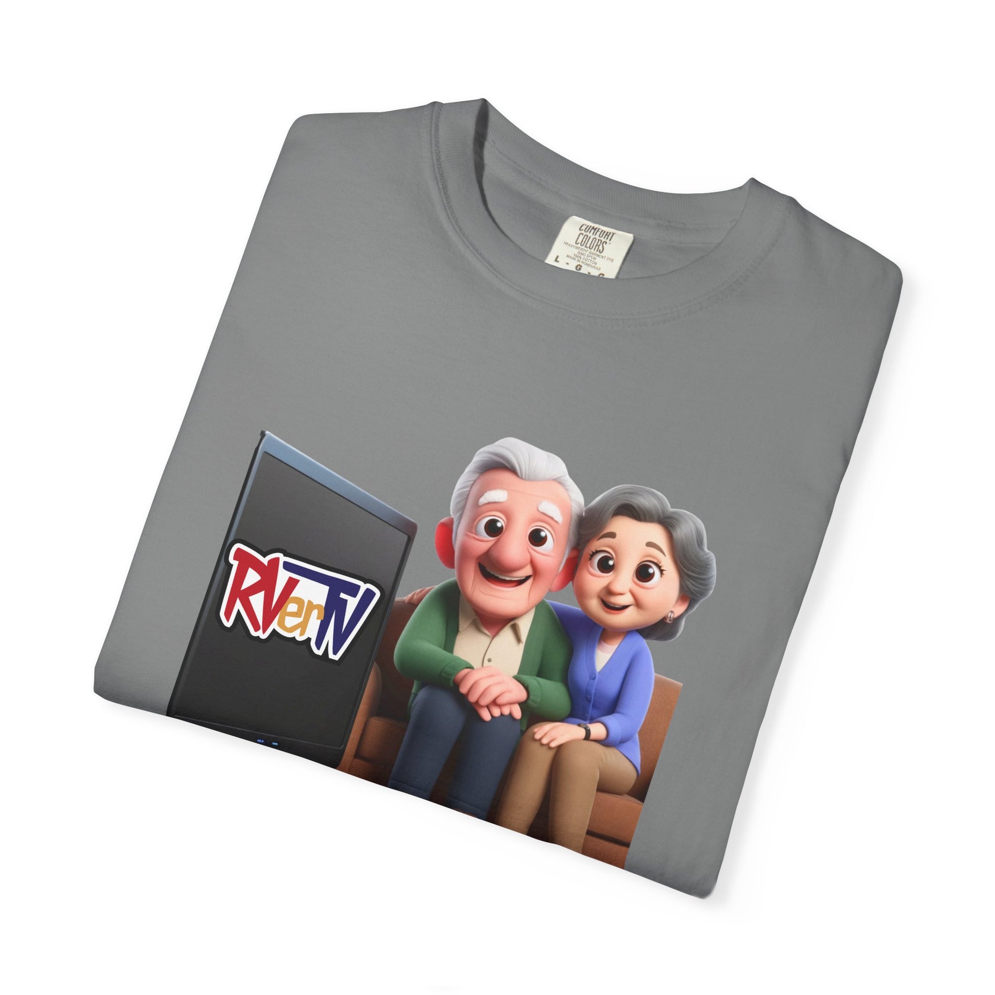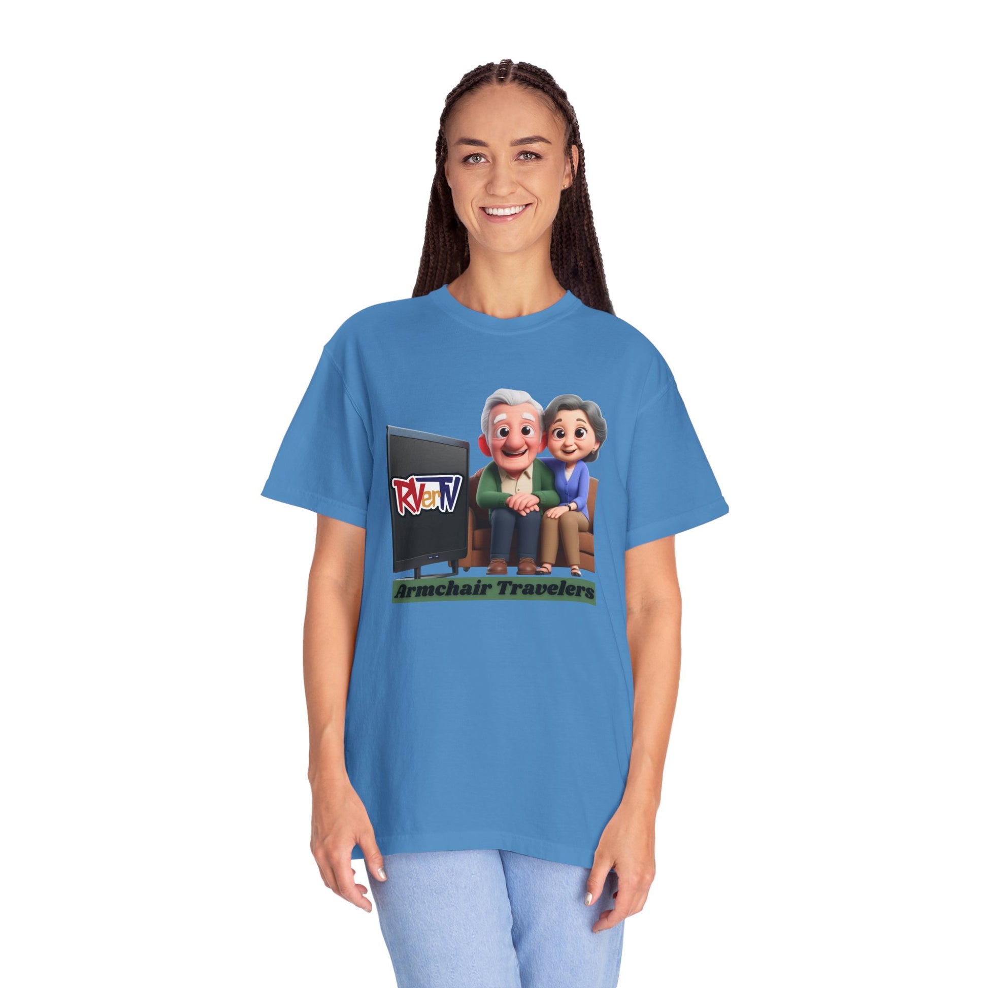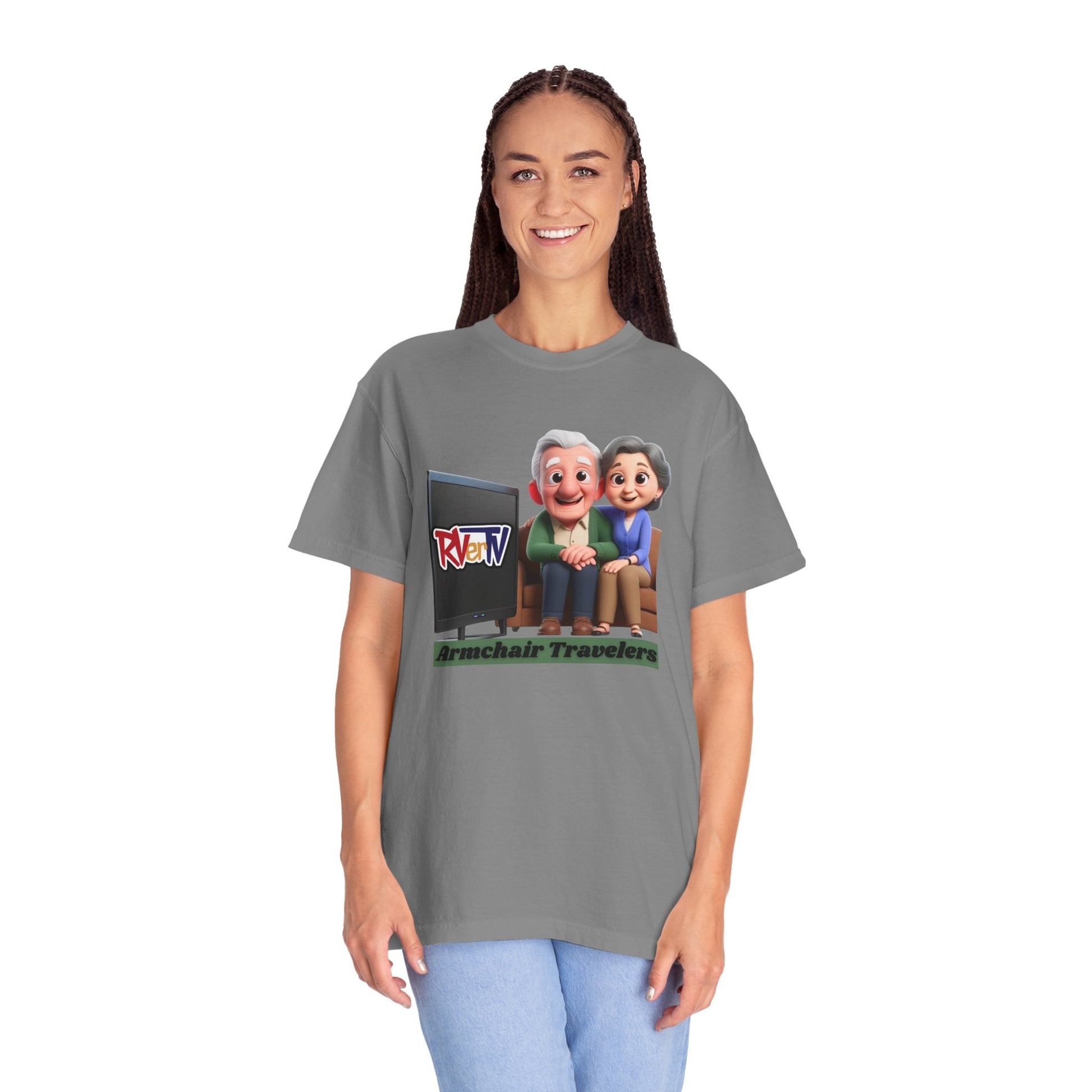 Meet our heartwarming "Armchair Travelers Couple" t-shirt, where wisdom meets wanderlust! This charming design features a snuggly senior duo who've mastered the art of sofa expeditions, complete with matching fuzzy slippers and their trusty TV remote. They're living their best RVerTV life from the comfort of their favorite couch—because who says you need to leave your recliner to hit the road?