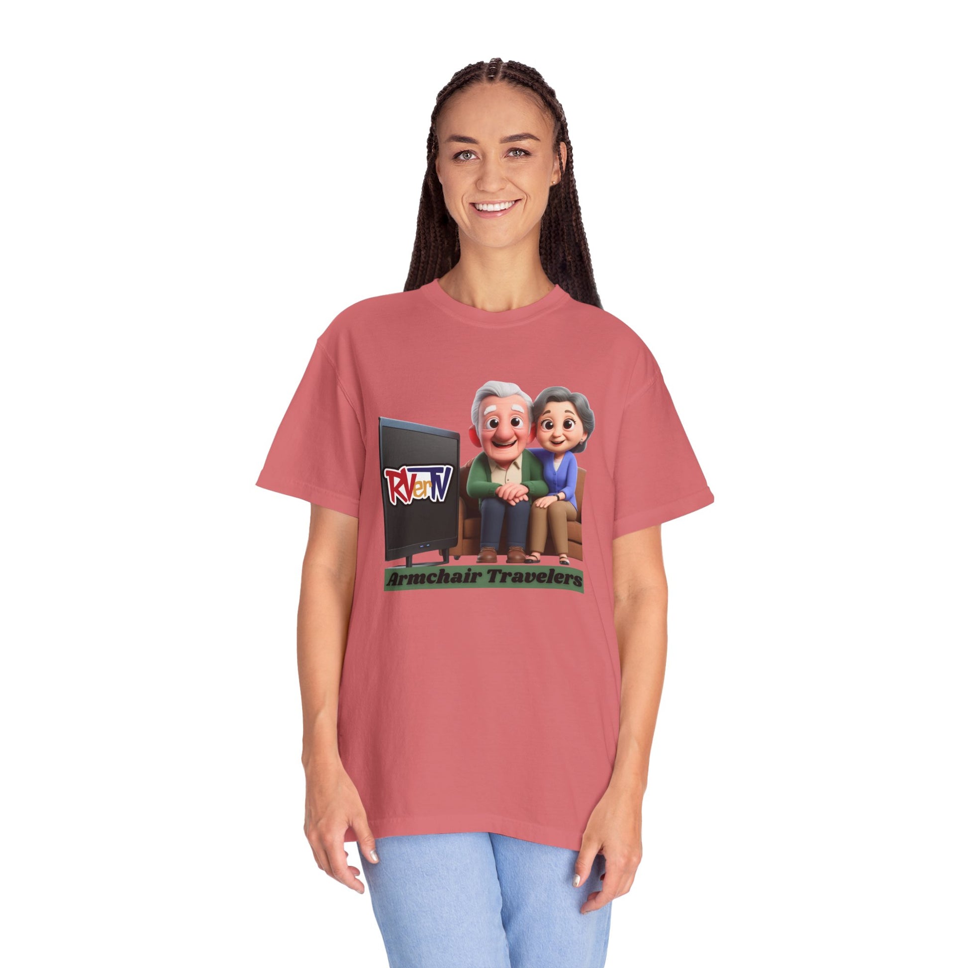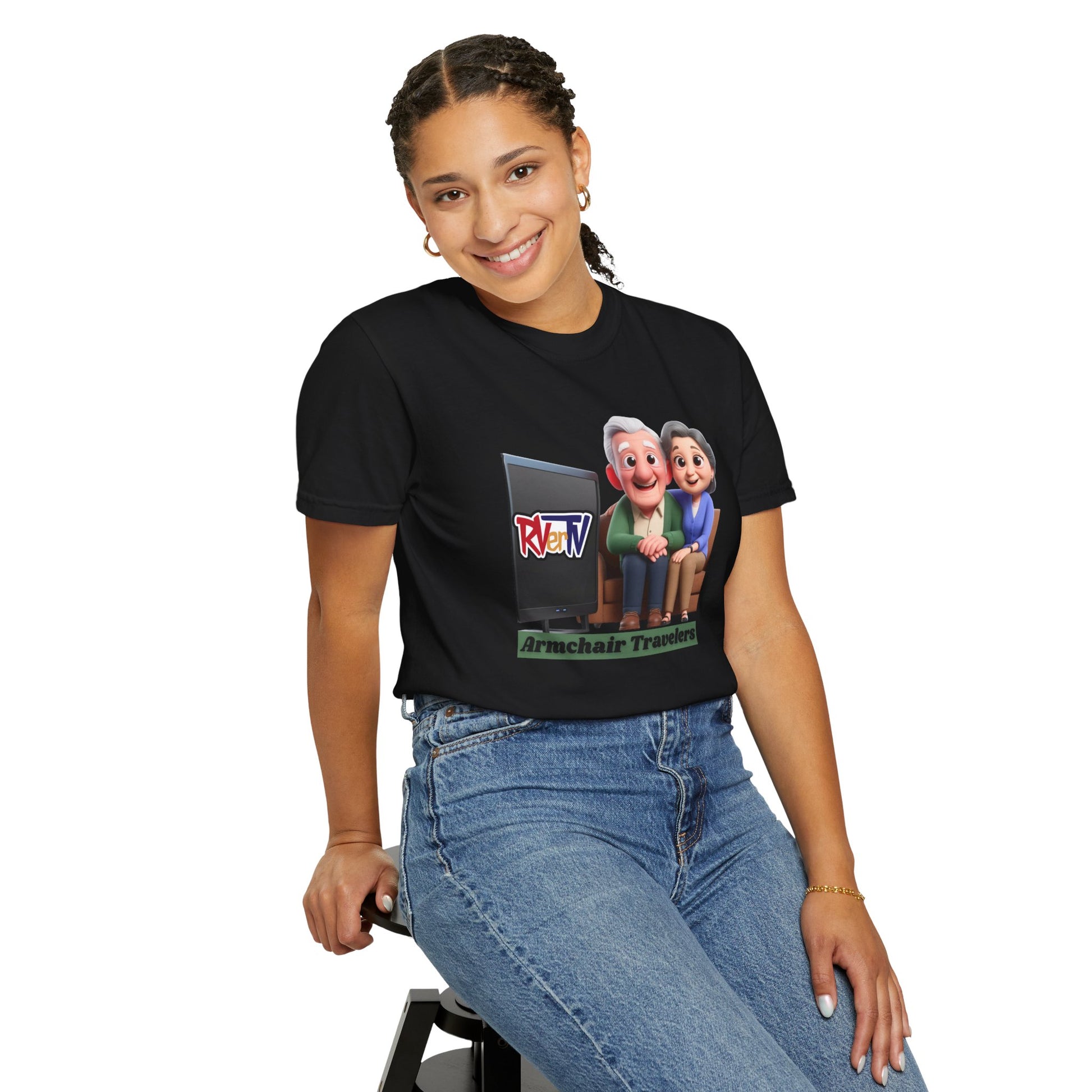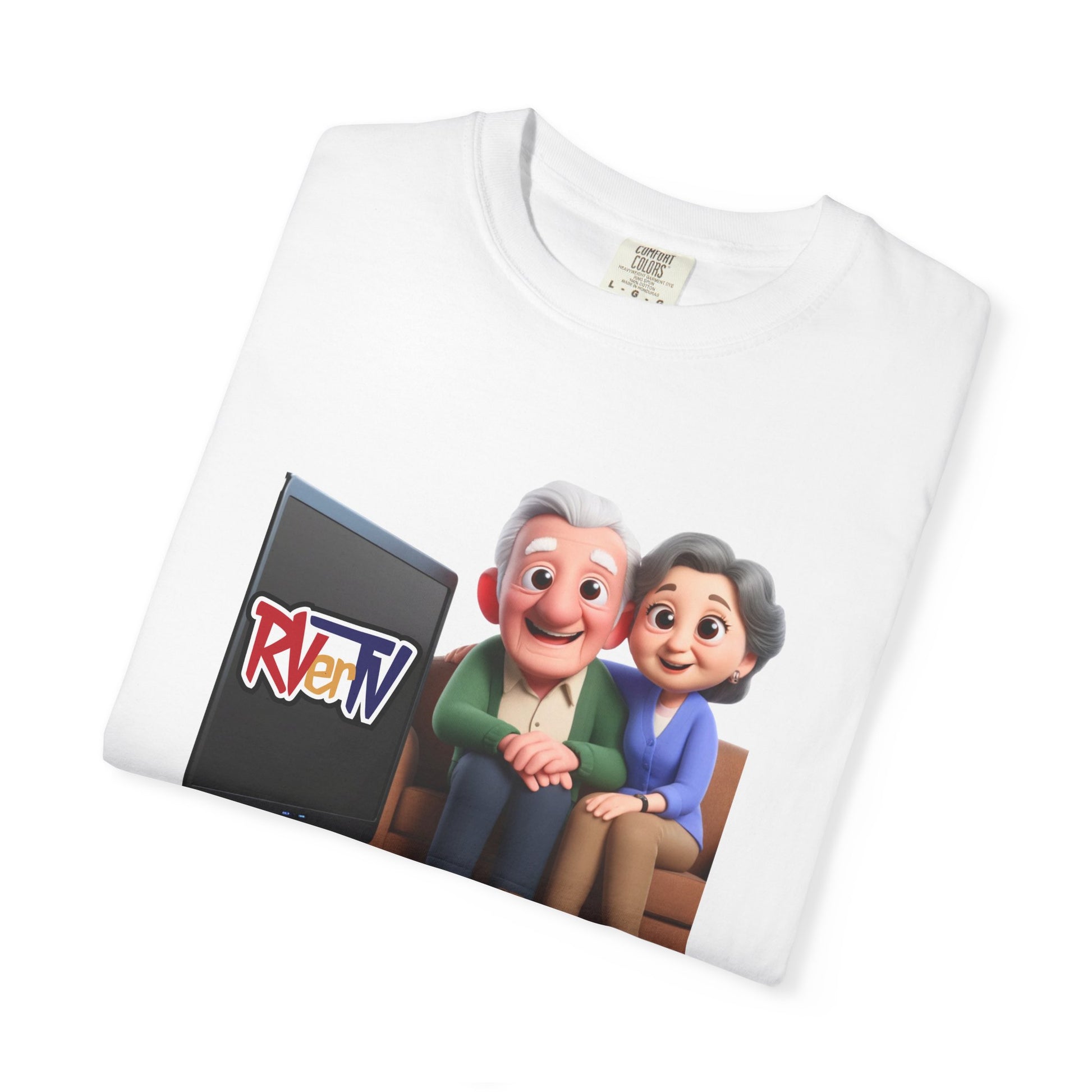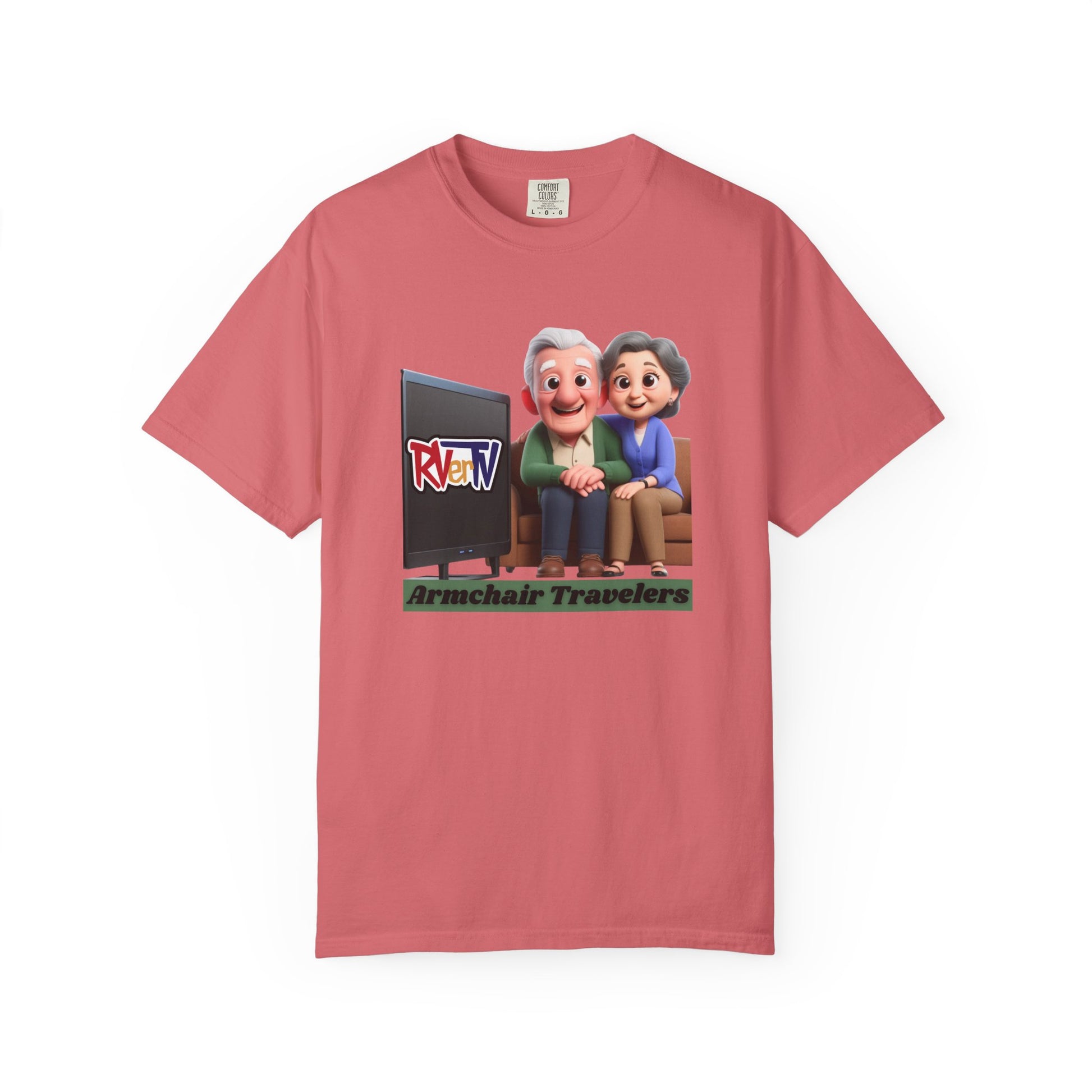 Meet our heartwarming "Armchair Travelers Couple" t-shirt, where wisdom meets wanderlust! This charming design features a snuggly senior duo who've mastered the art of sofa expeditions, complete with matching fuzzy slippers and their trusty TV remote. They're living their best RVerTV life from the comfort of their favorite couch—because who says you need to leave your recliner to hit the road?