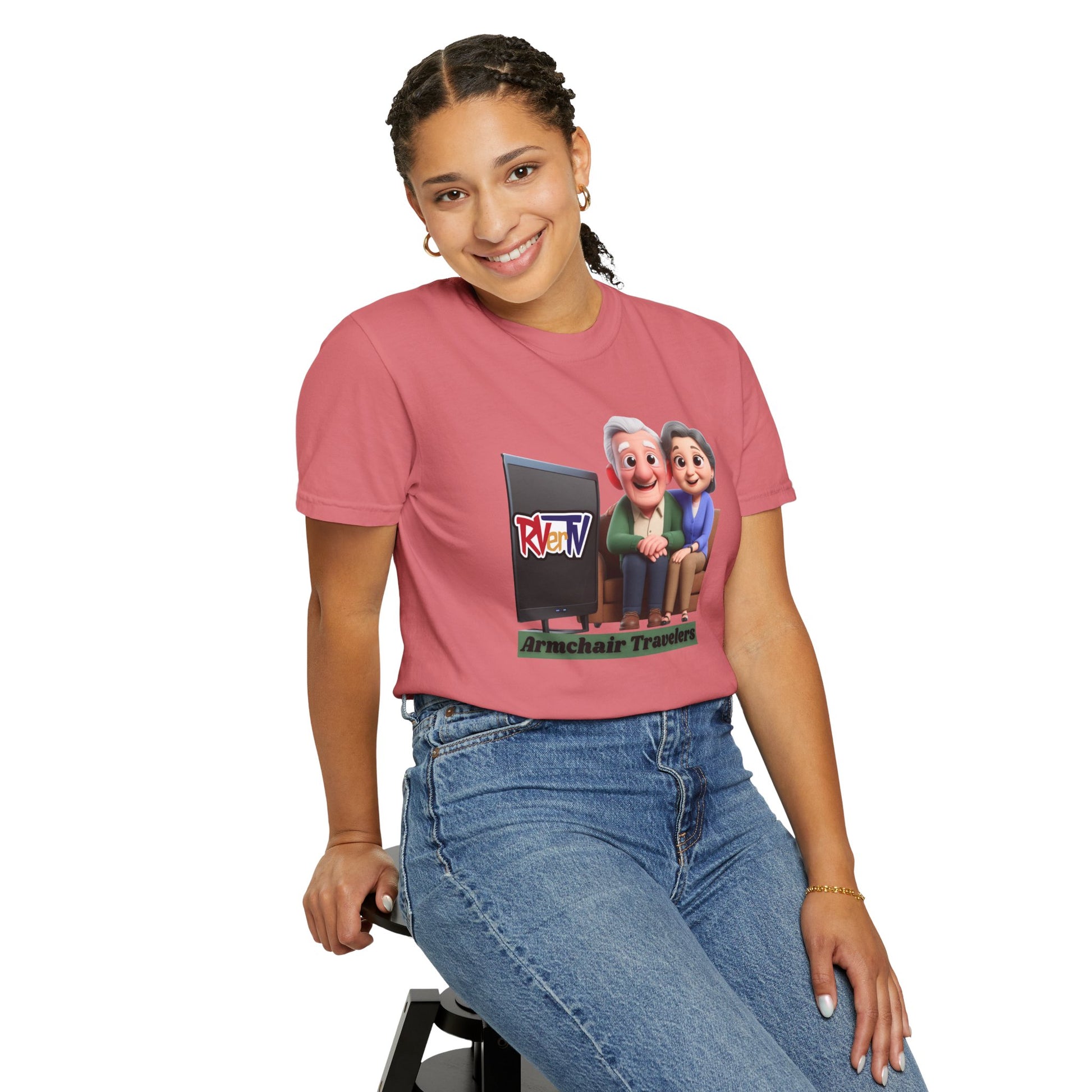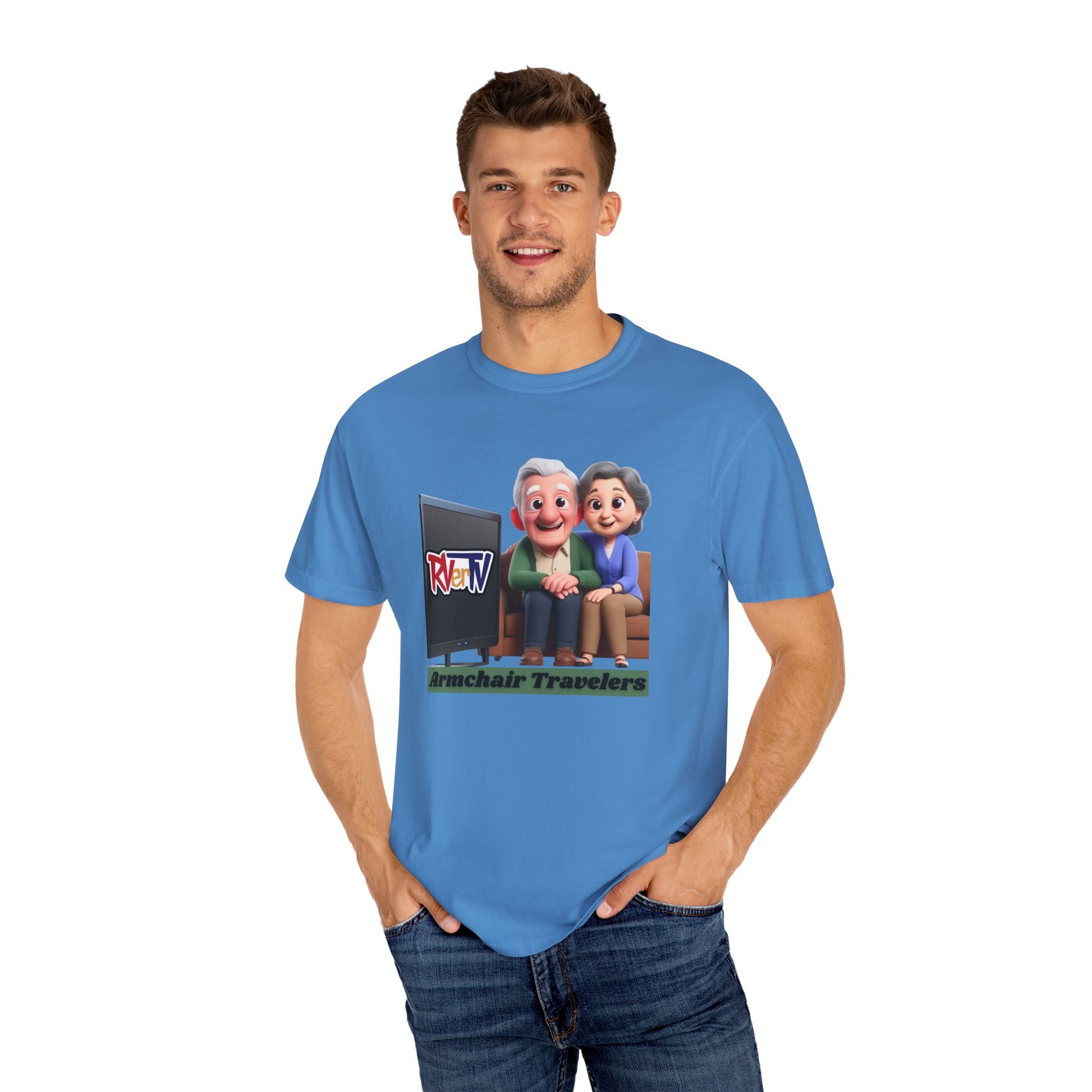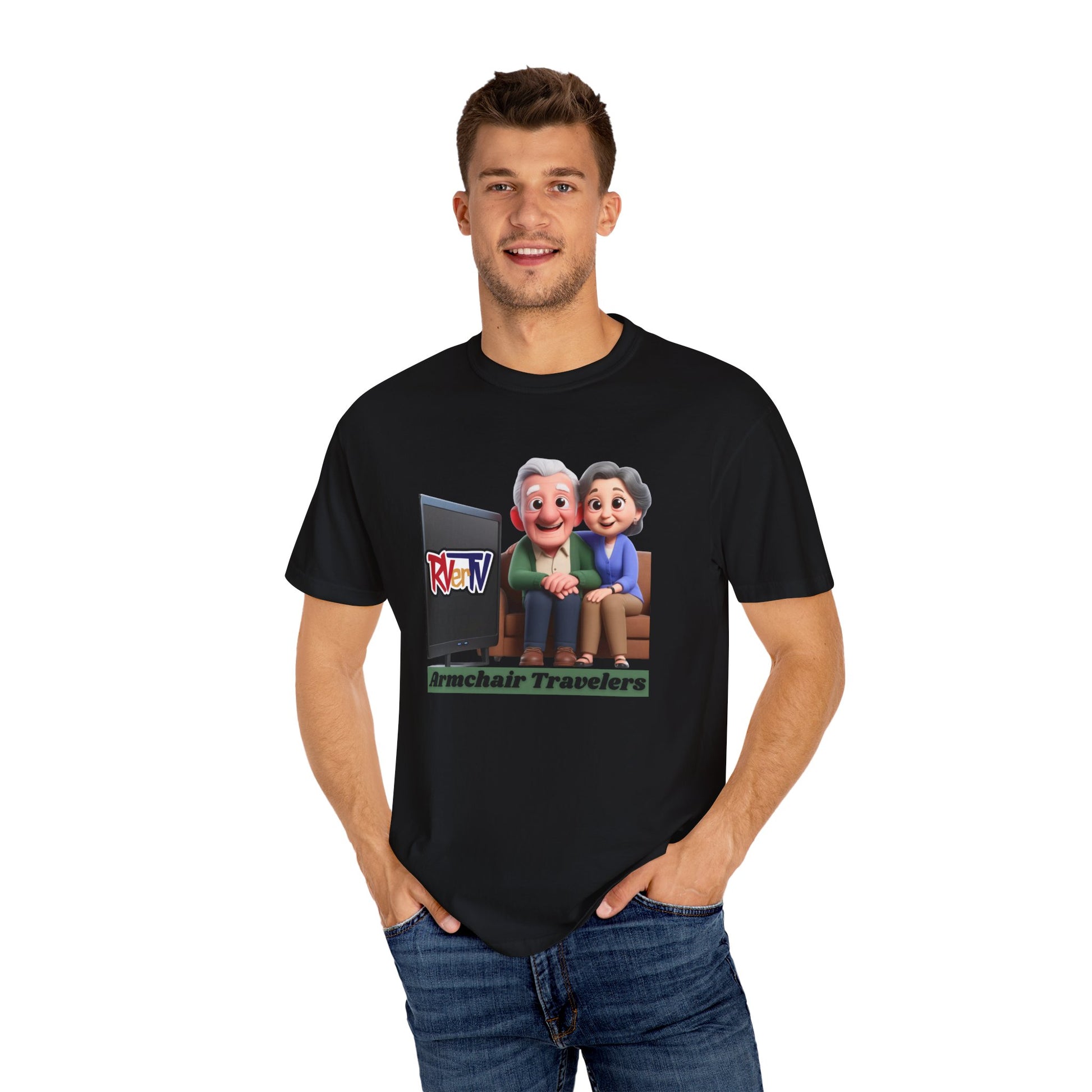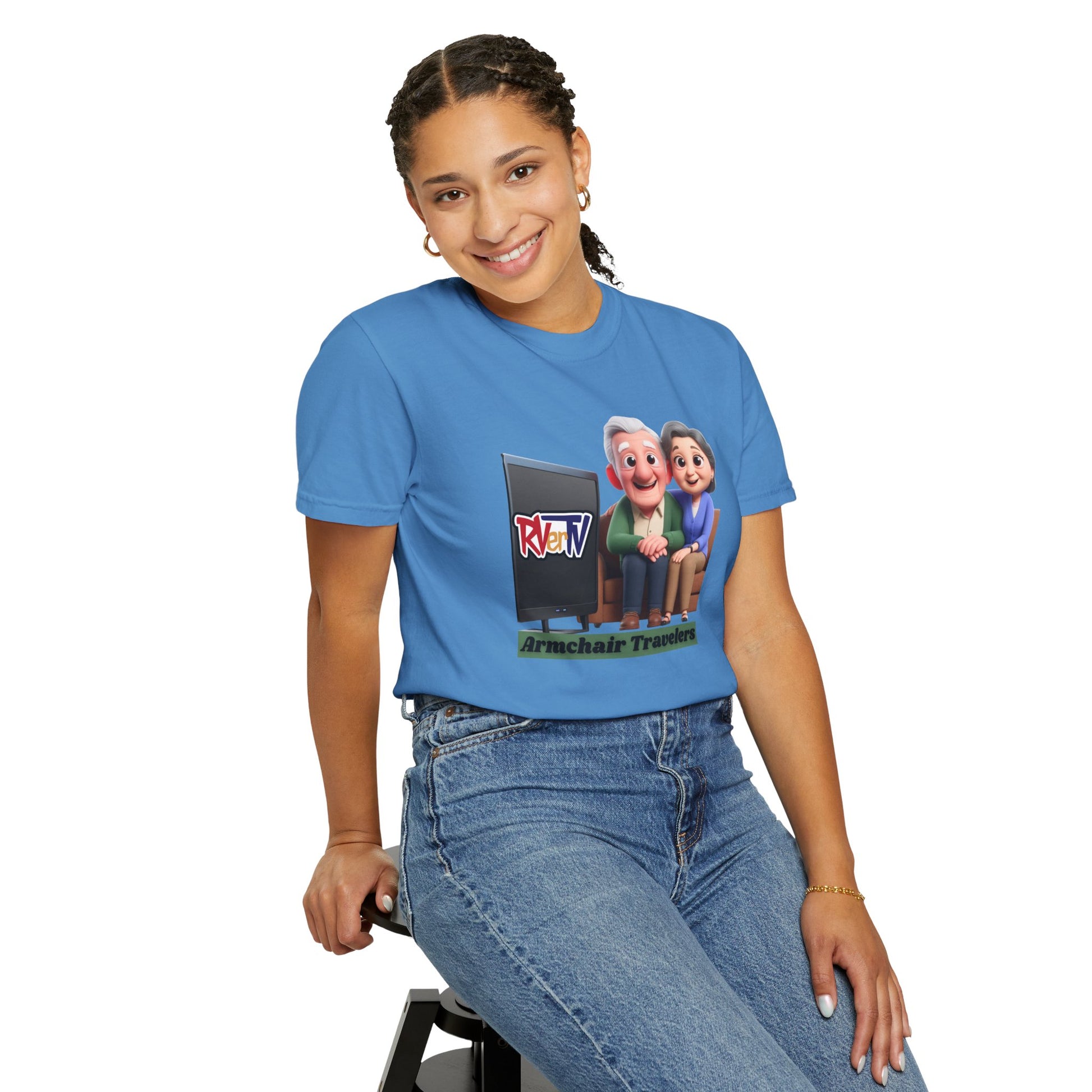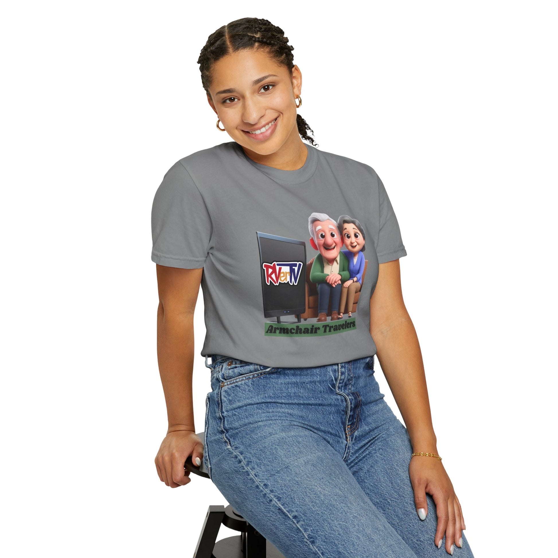 Meet our heartwarming "Armchair Travelers Couple" t-shirt, where wisdom meets wanderlust! This charming design features a snuggly senior duo who've mastered the art of sofa expeditions, complete with matching fuzzy slippers and their trusty TV remote. They're living their best RVerTV life from the comfort of their favorite couch—because who says you need to leave your recliner to hit the road?