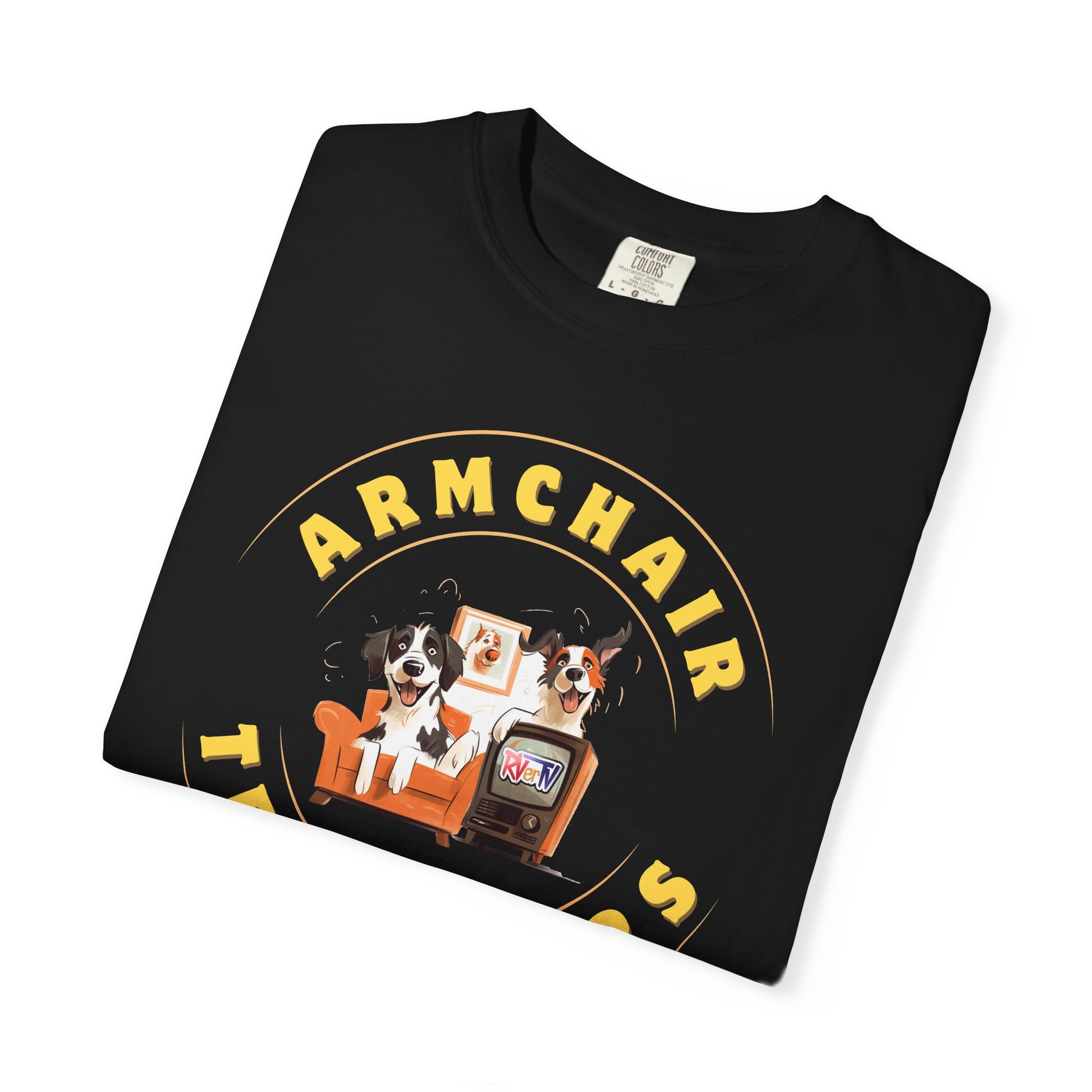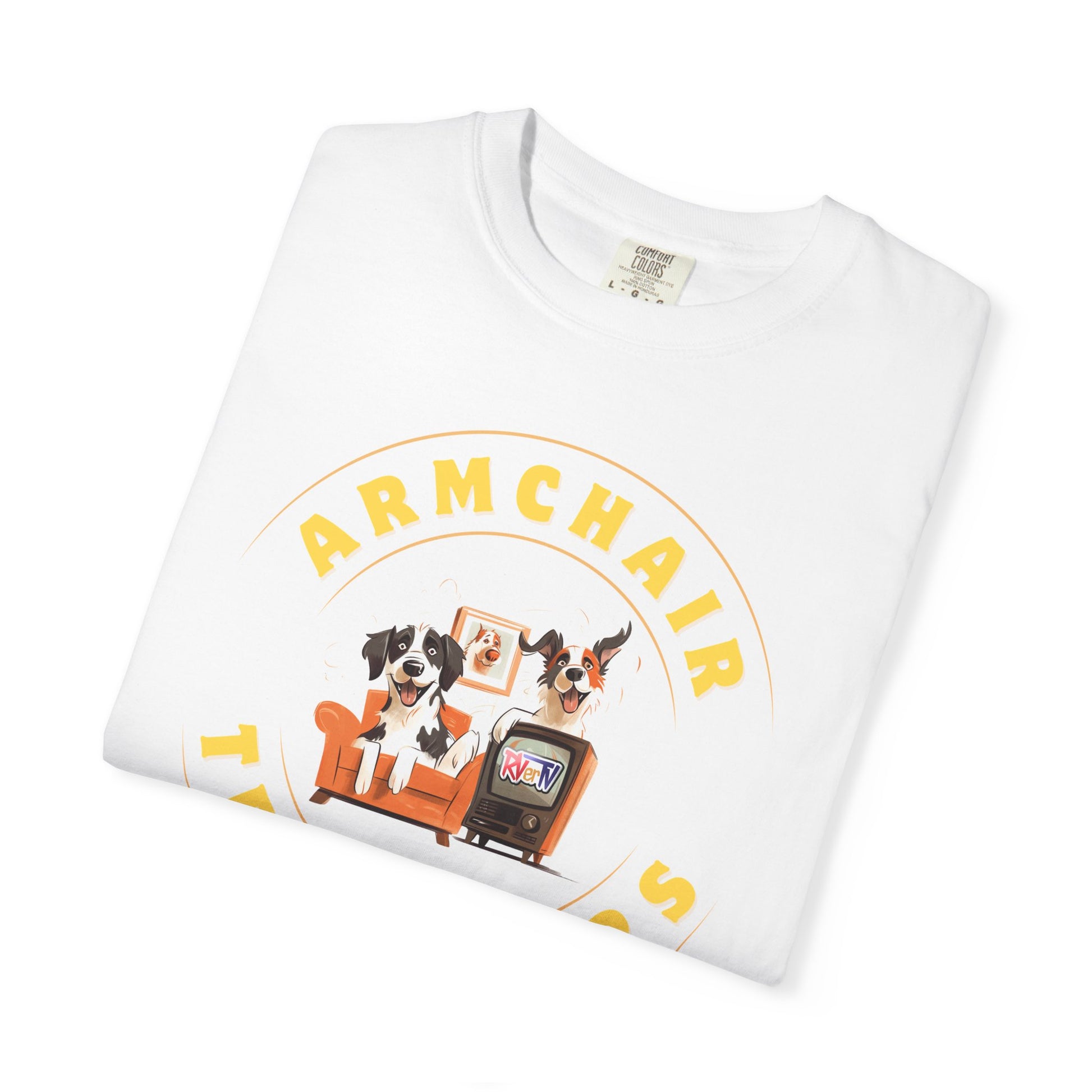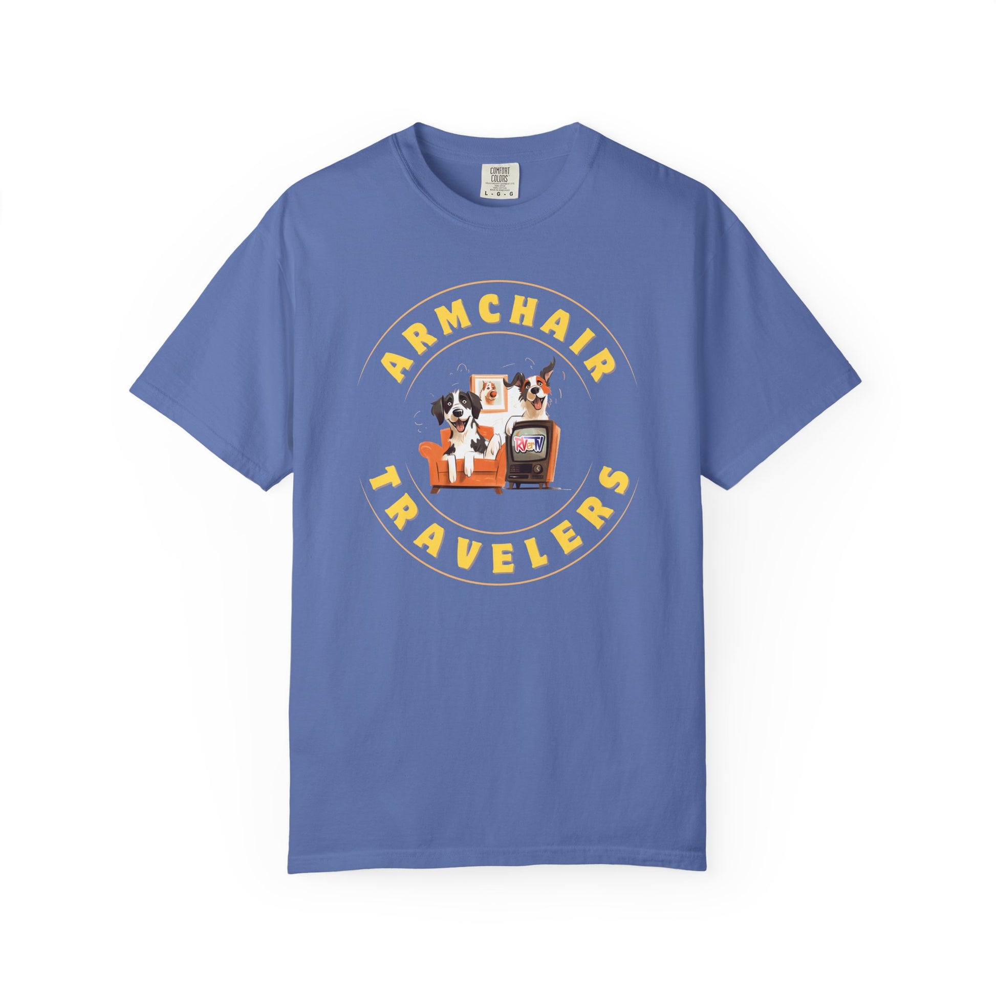 The RVerTV Furchair Travelers T-shirt captures the cozy charm of two adorable puppies curled up on a comfy couch, completely captivated by their favorite show on RVerTV. With their paws relaxed and eyes glued to the screen, this playful design adds a warm, heartwarming touch to any casual outfit, perfect for dog lovers and RV enthusiasts alike.